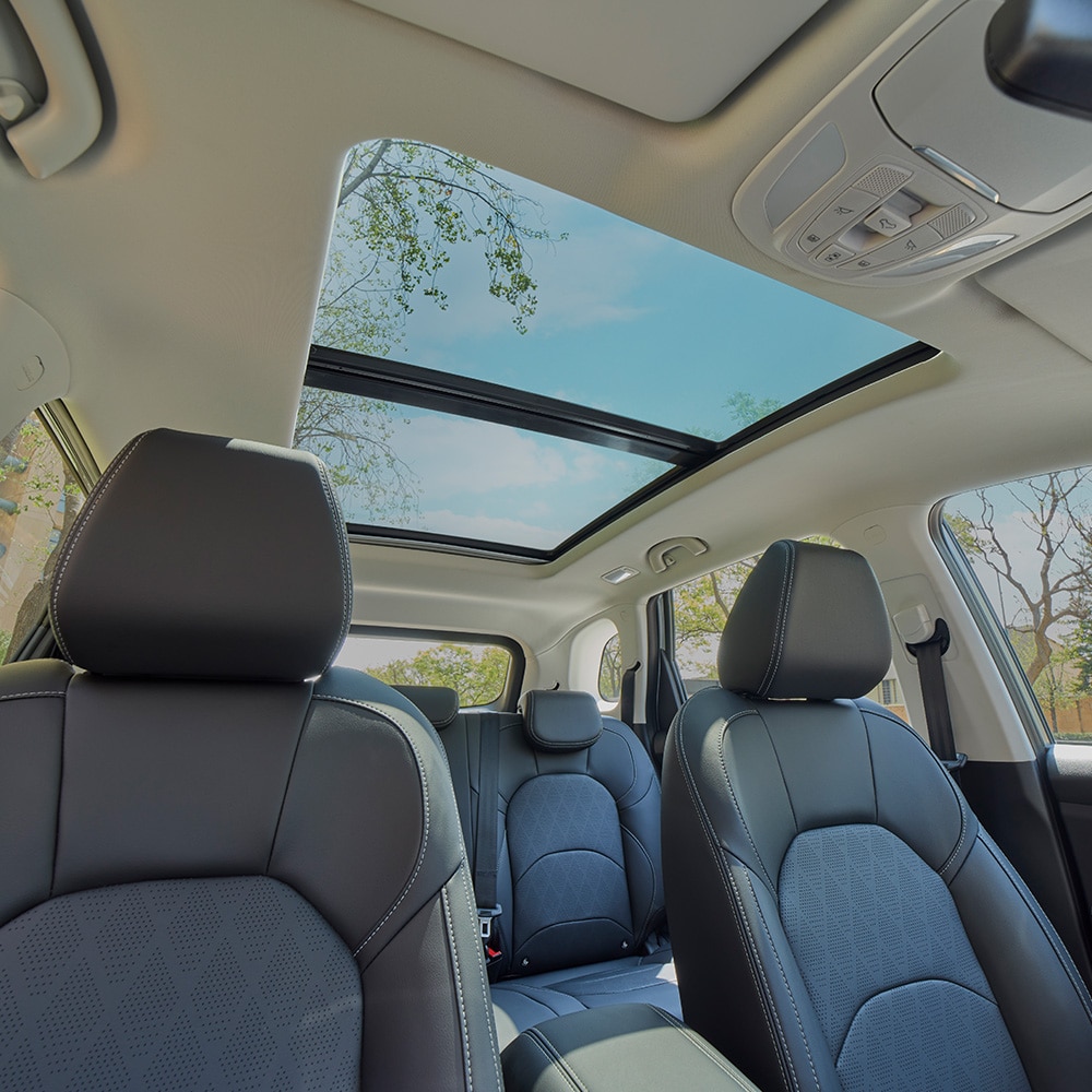 El techo panorámico ofrece más luz natural en la cabina, mientras que los rieles del techo son ideales para familias que buscan prepararse para viajes de campamento o paseos en bicicleta.